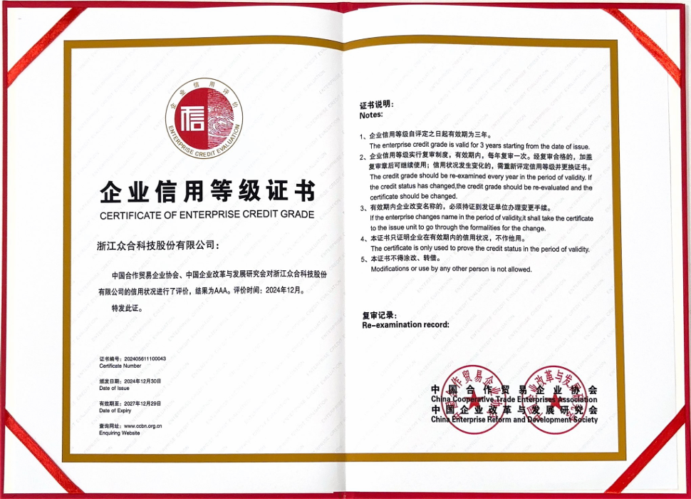 在新一輪科技革命與產業(yè)變革浪潮中,誠信經營是企業(yè)長久生存與發(fā)展的根基,亦是立于不敗之地的核心。長久以來,眾合科技始終嚴格履約踐諾,將誠信理念貫穿在營銷、管理、生產等各個環(huán)節(jié),憑借健全的信用管理體系、優(yōu)良的合同履約信用狀況和良好的市場信譽,榮獲了“2023年浙江省AAA級守合同重信用企業(yè)”等榮譽,展現(xiàn)了公司在推動行業(yè)信用體系建設中的卓越表現(xiàn)。