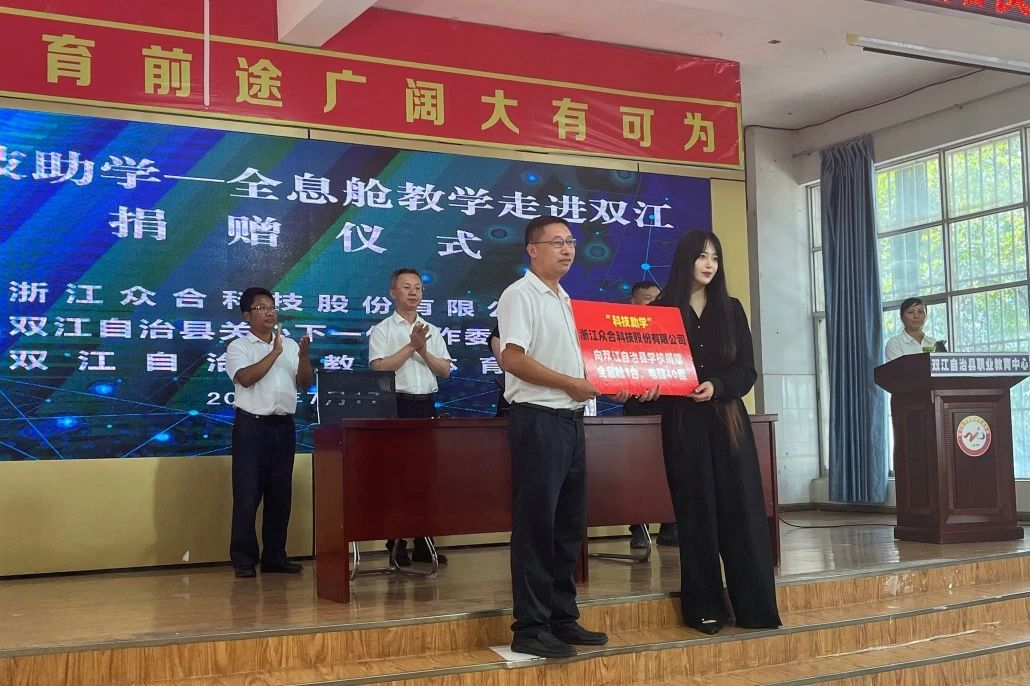 7月初,當(dāng)臨滄市委書記杜建輝率團(tuán)考察眾合科技時(shí),雙江自治縣便與眾合科技達(dá)成了戰(zhàn)略合作,雙方約定在科技助學(xué)、科技助農(nóng)、自然資源保護(hù)開發(fā)及茶產(chǎn)業(yè)數(shù)字化等領(lǐng)域展開深度合作?;谶@一合作共識(shí),今日,云南省臨滄市雙江自治縣職業(yè)教育中心報(bào)告廳內(nèi),“AI科技助學(xué)——全息艙教學(xué)走進(jìn)雙江”捐贈(zèng)儀式溫暖啟幕。這不僅是眾合科技ESG行動(dòng)計(jì)劃的又一次重要實(shí)踐,更為雙江自治縣的教育與農(nóng)業(yè)發(fā)展注入了新的科技動(dòng)能。